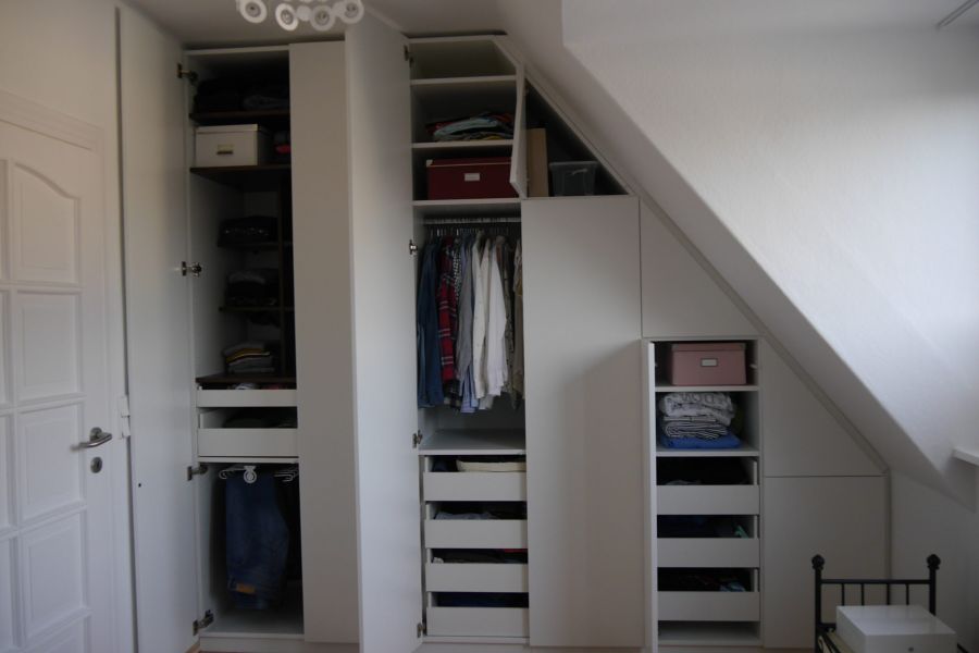 Abhängig von Bauart und Größe. Mit einer maßgefertigten Lösung wird aus jeder Nische ein Stauraumwunder. Ein clever geplanter Schrank unter der Schräge oder an der „Giebelseite“ mit individuell angepassten Türen, Passblenden und ggf. Schubkästen liegt meist im Bereich von 3.500 bis 7.500 Euro. Je höher Ihre individuelle Anforderung und durchdachter die Details ausfallen, desto aufwendiger wird die Planung und Fertigung. Denn hier ist nichts Standard, alles wird millimetergenau angepasst.